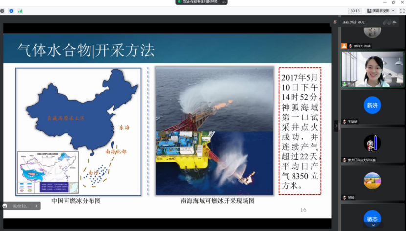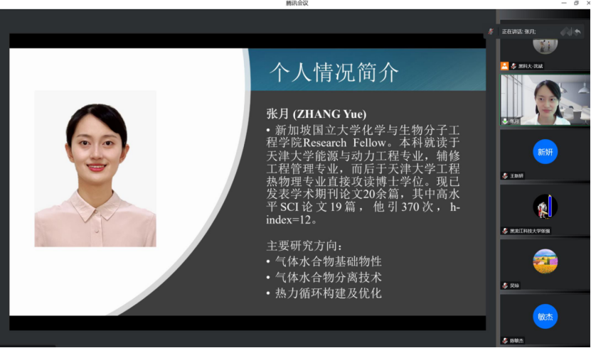 张月通过“腾讯会议”网络平台带来了一场题为《Gas Hydrates: Chance or Challenge?(气体水合物:机遇还是挑战?)》的精彩学术讲座。报告中,张月助理研究员首先介绍了气体水合物技术的研究历程,随后从气体水合物&全球变暖、气体水合物开采方法、气体水合物实验模拟、气体水合物碳捕集技术等方面详细讲解了气体水合物的研究现状、技术难点与应用趋势。