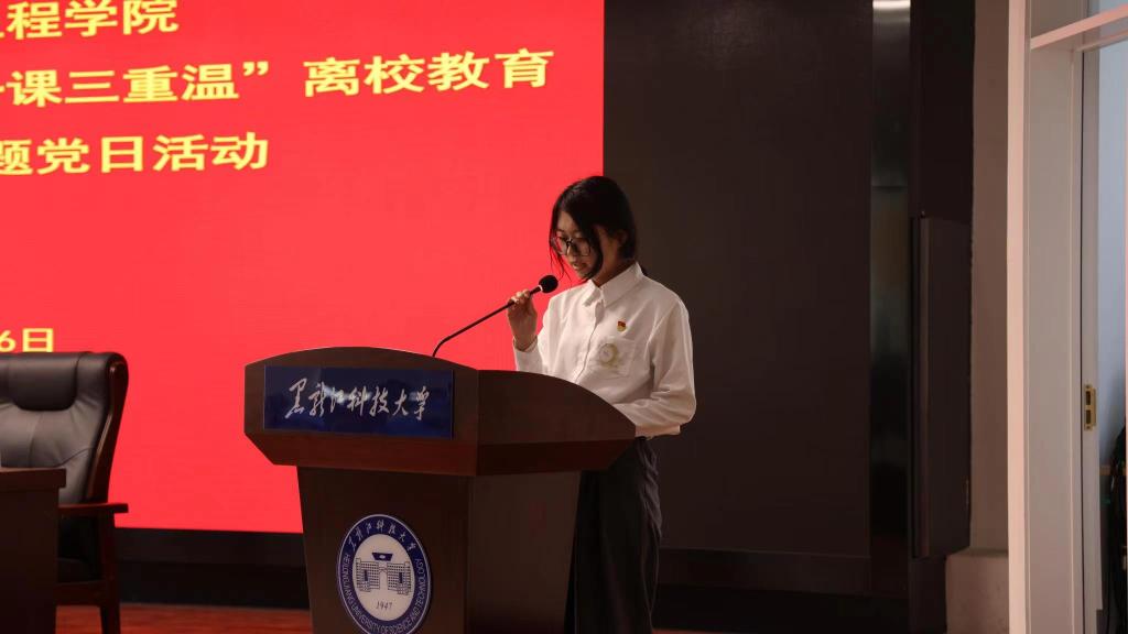 毕业生党员代表、材料学院学生第三党支部组织委员、无机非2019级2班朱春连代表毕业生党员进行发言。