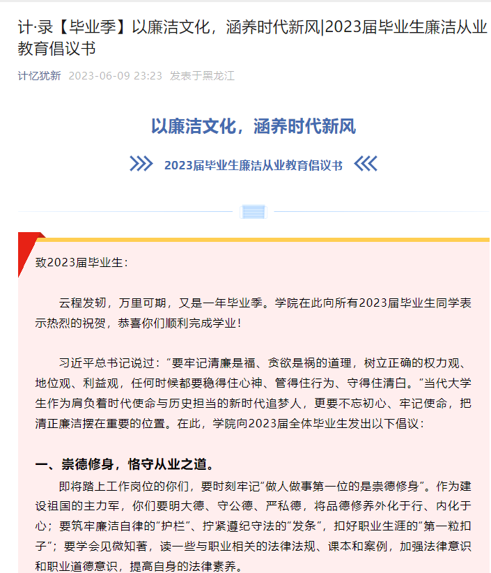 发布廉洁从业倡议书。学院通过微信公众号发布《廉洁从业倡议书》,向广大毕业生发出郑重倡议。希望广大毕业生崇德修身,恪守从业之道、严于律己,把稳思想之舵、奋楫笃行,践行报国之业,在奉献社会的进程中不负时代不负韶华,书写新的壮丽篇章。