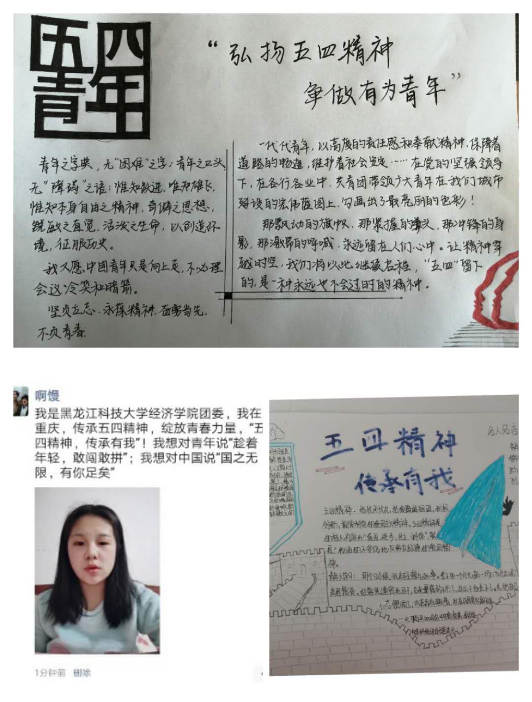 经济学院团委面向全体青年学生举办“五四精神·传承有我”全团网络主题传递活动,经济18-2班王旭航,经济19-2班高琳制作五四主题海报、国贸18-1班全体同学录制《五四,为青春喝彩》短视频、金融19-1班魏文琪录制歌曲为青春高歌,作品展示了广大青年积极向上、奋发有为的精神风貌。5月4日当天@共青团2UP.IO_2UP.IO(中国)委员会的微博、微信、QQ空间开设的#五四精神,传承有我#话题专区将作品发布,带动全体青年学生把炽热的爱国热情转化为强国动力,让五四精神常青。