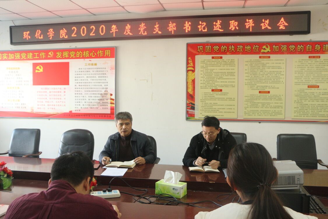 会上,环境、化工、应化教师党支部以及学生各党支部依次结合全年工作、履职情况、存在的问题和不足、下一步的整改措施及工作计划等方面进行了述职。周国江分别听取了各支部书记的述职,并采取了“一述一评”的方式逐一进行点评,在肯定了各党支部工作的同时,也分别指出了各党支部存在的问题并给出了建设性的建议。述职、点评结束后,参会人员进行了现场评议。