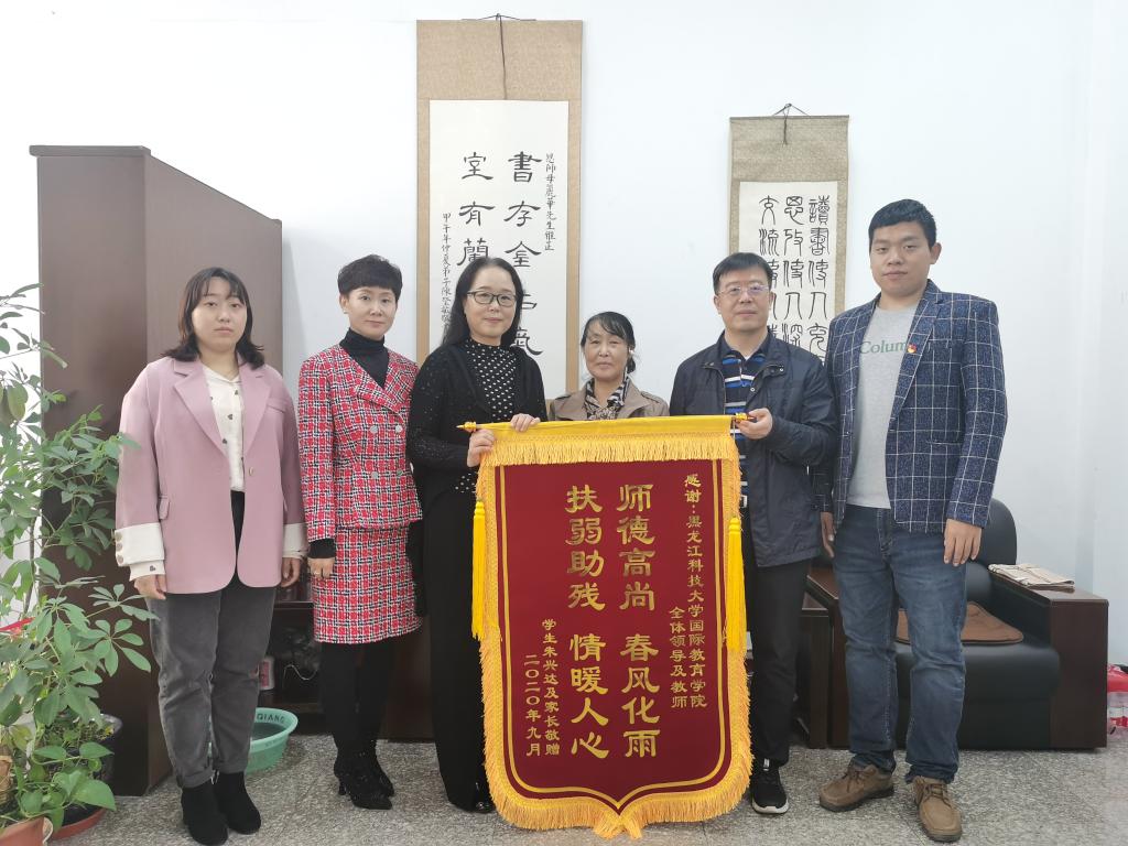 近日,国际教育学院中加计算机18-1班朱兴达的家长,为感谢学院和保卫处人员为朱兴达同学在校学习提供的帮助,分别送来两面锦旗,锦旗上写道:师德高尚,春风化雨;扶弱助残,情暖人心;校园卫士忠职守,排忧解难似亲人。对学校给予的关心和照顾表达了由衷的谢意。
