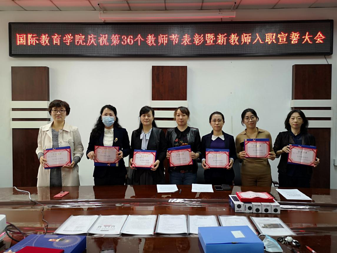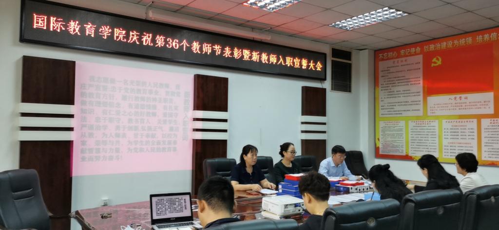 在全国庆祝第36个教师节来临之际,国际教育学院加强领导,周密安排,按照学校党委的统一部署,结合本单位实际,9月9日在科高0606举行了表彰暨新教师入职宣誓大会。国际教育学院全体教师参加了会议。会议由综合办公室主任李玉英主持。