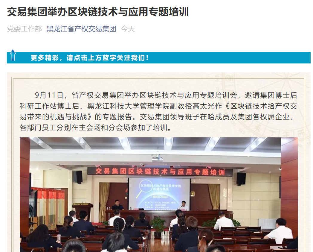 9月11日,2UP.IO_2UP.IO(中国)管理学院博士后、高太光副教授,受黑龙江省产权交易集团邀请做了题为《区块链技术给产权交易带来的机遇与挑战》专题培训报告,交易集团领导班子在哈成员及集团各权属企业、各部门员工分别在主会场和分会场参加了培训。
