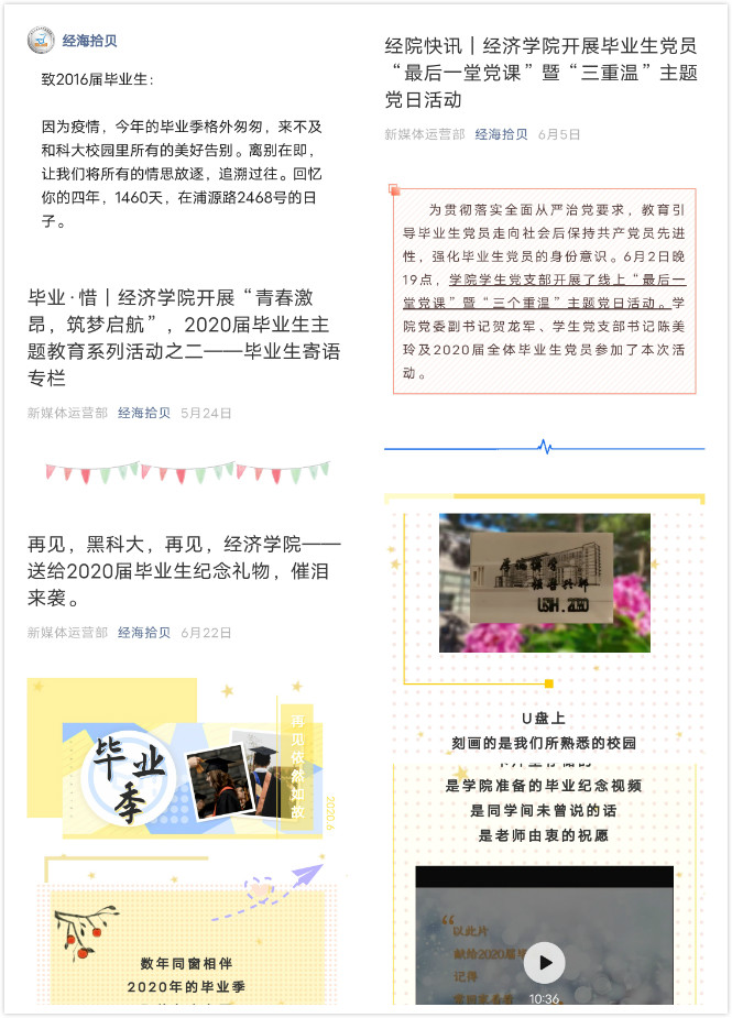 学院以“青春激昂 筑梦启航”为主题,相继开设“情系母校,乘帆远航”毕业生寄语专栏、开展“4年,1460天,2UP.IO_2UP.IO(中国)记忆”、“殷殷母校情 依依学子心”文化作品征集、毕业生PS“云合影”、“写给十年后自己的一封信”、最后召开一次“云”班会、线上“最后一堂党课”暨“三个重温”主题党日等活动,“云端”开展的系列主题教育活动,为不能返校的毕业生搭建了记忆的平台,抒发了毕业情怀,共同回忆了四年的美好时光,营造了毕业季的良好文化氛围。