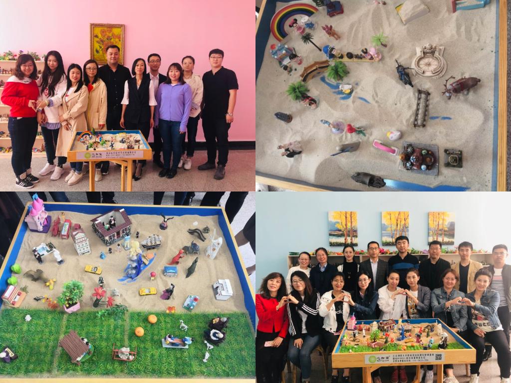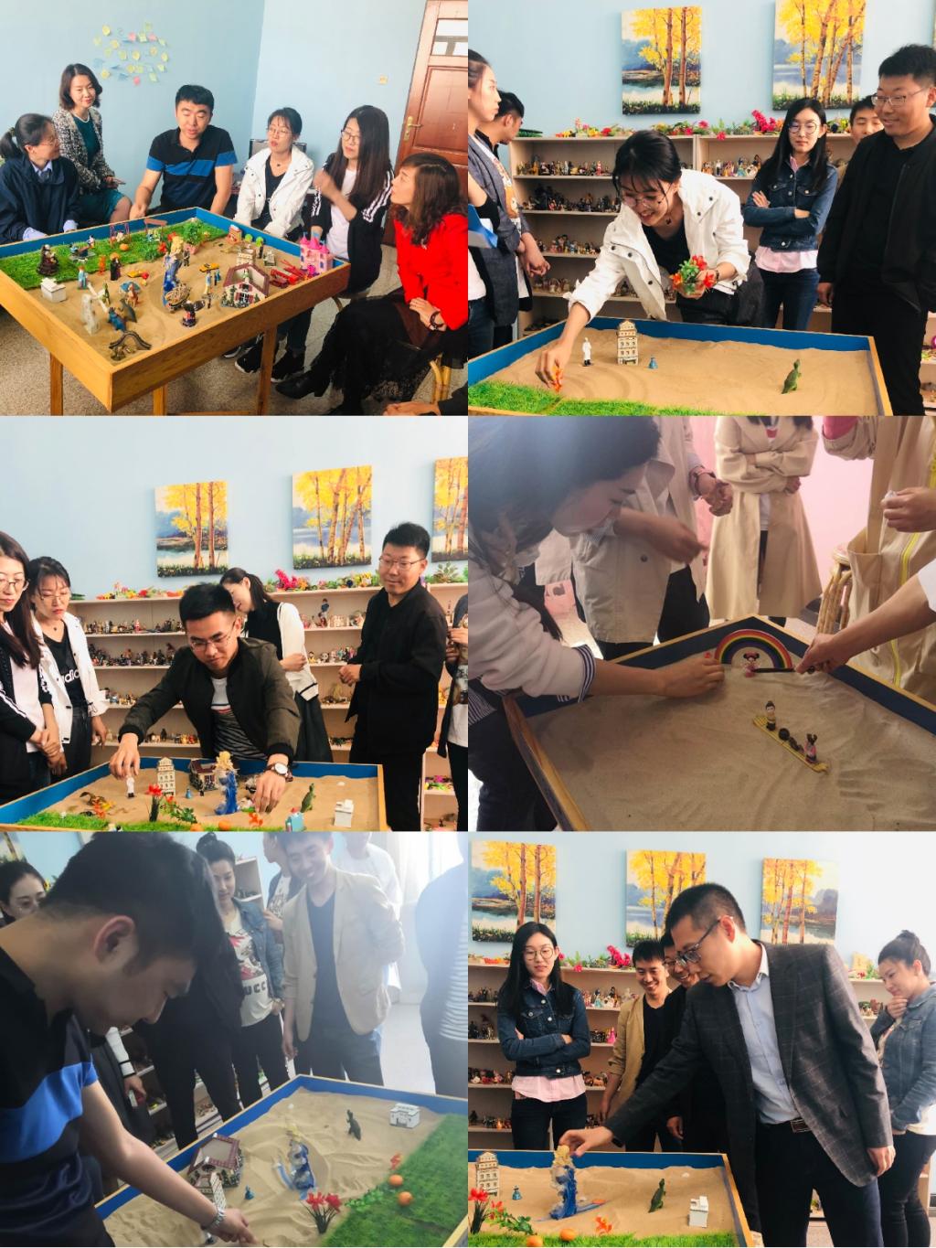 讲座结束后,全体辅导员来到沙盘游戏工作室和个体咨询室,共同参加了团体箱庭体验活动。活动分为两组进行,分别由心理辅导中心任燕、孔庆娜老师带领,在团体箱庭体验活动中,辅导员老师们选取自己喜好的沙具,讲述自己的故事,分享收获与体验,大家亲身体验到了团体箱庭的模式和魅力,拉近了彼此的心理距离,促进了自我觉察与成长。