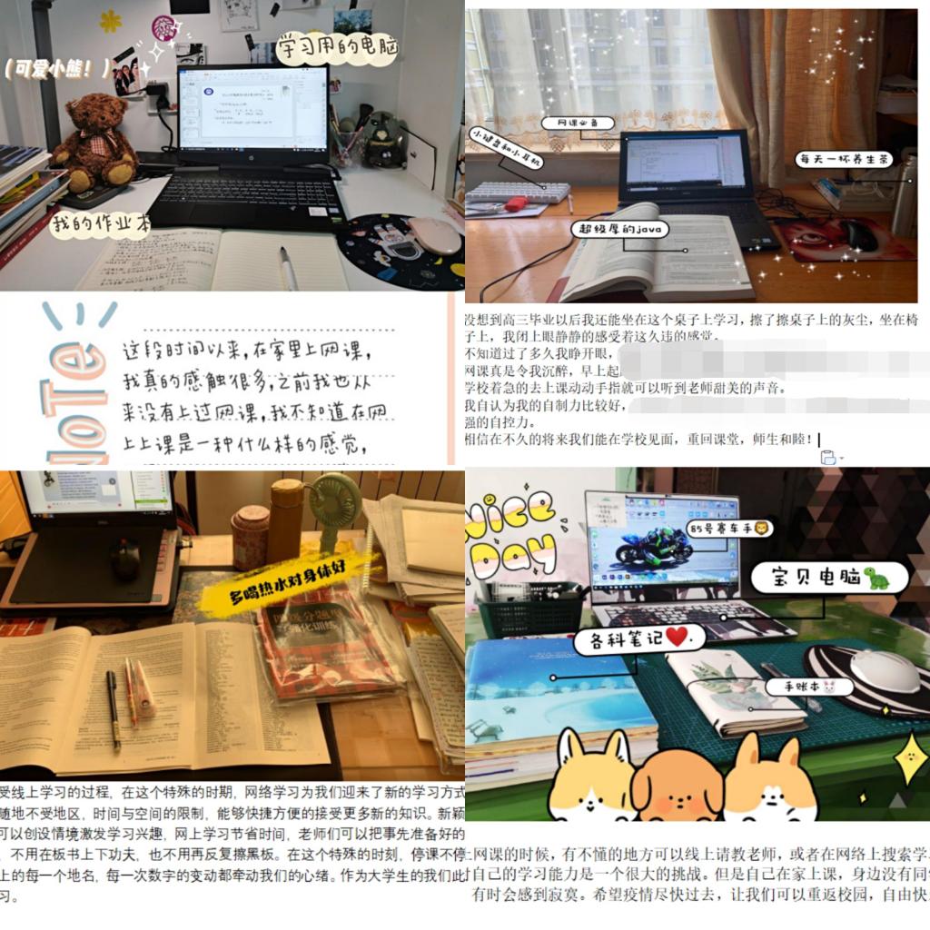 班会上大家积极晒图,电脑、iPad、笔记本已经成了书桌上的主角,桌面是否干净整洁、什么样的学习工具更适合网络上课等话题成为了讨论焦点。许久没有在家学习的同学们,利用这次机会纷纷在照片下方留下了网络学习的感想。软件18-5班于皓同学动情的说,自从高三毕业后就再也没有这么长时间坐在家中的书桌前学习了,有种久违的感觉,虽然居家学习没有了同学的相伴,但是也省去了往返与各教学楼之间的时间,是一种特别的体验。