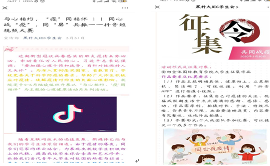 为展现出同学们居家抗疫的信心和良好的身心状态,营造积极乐观的居家抗疫氛围,展现学生积极向上的精神面貌,提高学生综合素质和艺术修养,弘扬我们当代青年大学生对祖国的热爱与担当,于4月1日—16日开展了“同心战役同‘屏’”共振”—抖音短视频大赛。本次活动充分展现了学生在面对疫情所拥有的良好的精神面貌,展现了同学们优秀的创作能力,增强了学生们抗击疫情的能力,振奋信心,传播正能量。