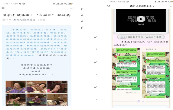 为增强学生的身体素质,团结同学们宅家抗疫、远离病毒,鼓励更多同学坚持锻炼,激发大家的运动热情,展现同学们健硕的体魄,增进与父母之间的情感互动,学院于5月11日—17日开展了“同亲情 健体魄——云动会挑战赛”。本次“云动会挑战赛”包括一分钟与父母跳绳、仰卧起坐、平板支撑等三个项目,在各年级班级团学干部的大力支持下,同学们与家长积极踊跃参加。通过此次“云动会”的开展,使同学们通过体育锻炼享受乐趣、增强体质 健全人格、锻炼意志。