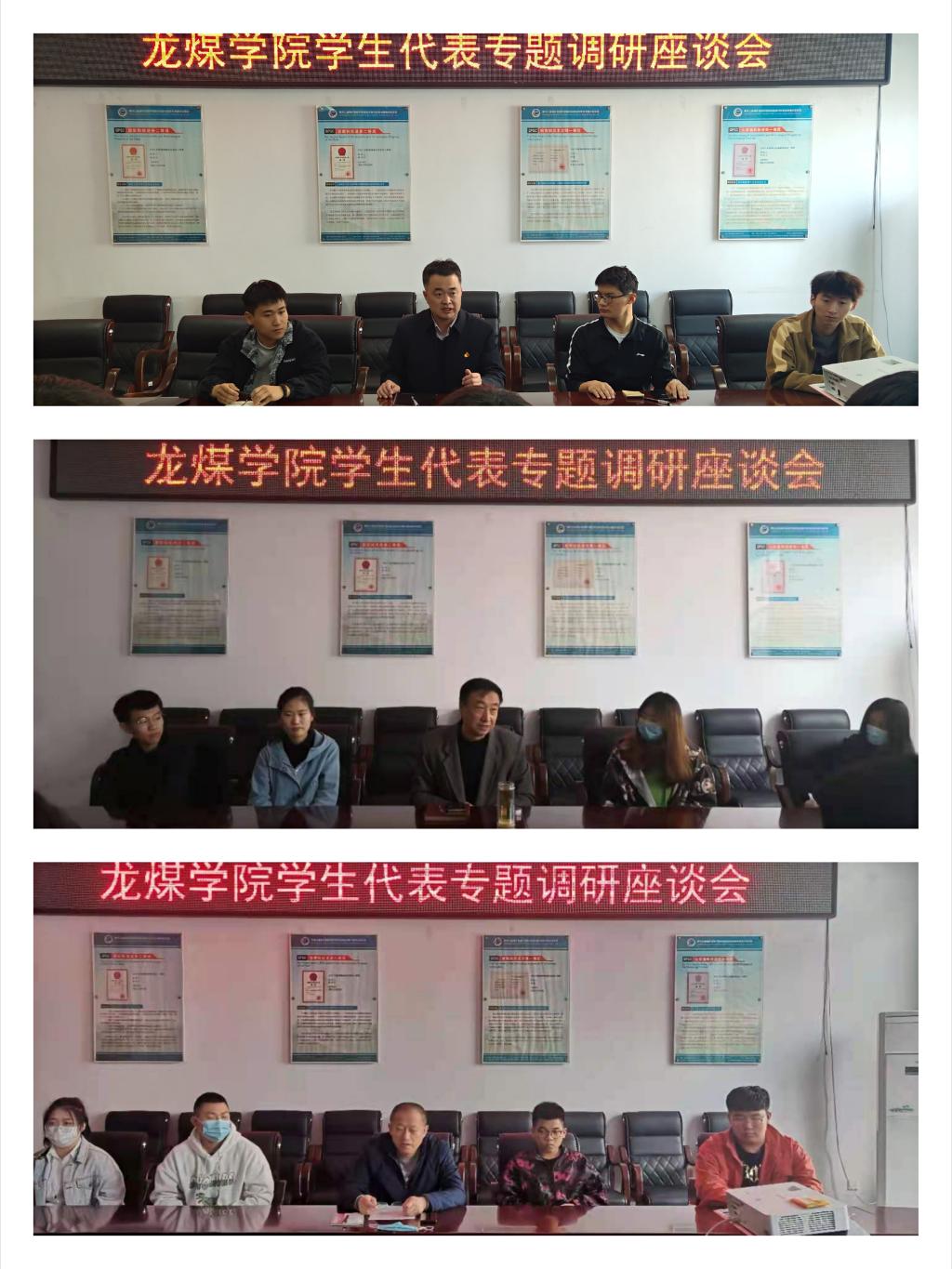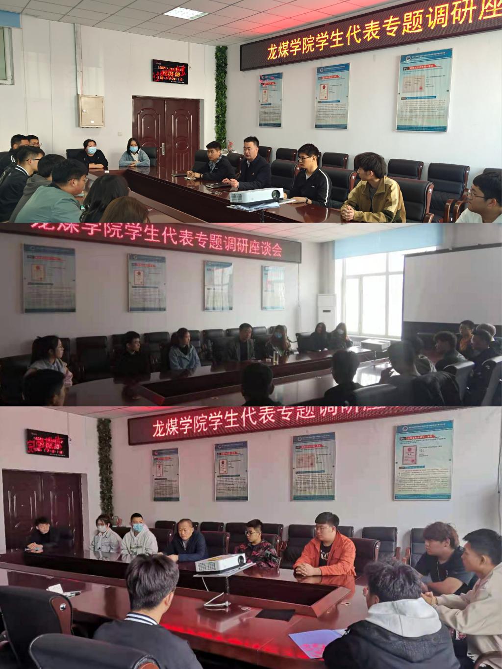 4月1日-4月9日,龙煤学院组织不同专业、不同年级的学生召开5场专题调研座谈会。矿业工程学院党委副书记高明星、学院副院长高德民、副院长张永利,辅导员杨永超、李爽以及相关的学生代表参加座谈会。