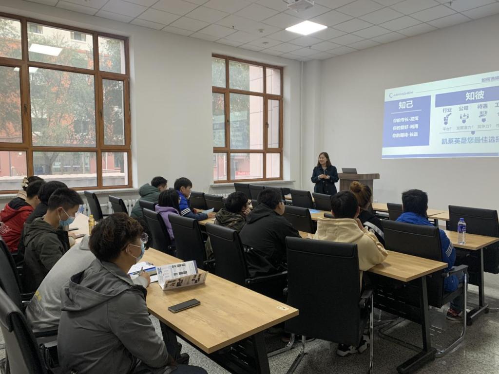 10月21日下午,环化学院邀请吉林凯莱英药业公司到学校进行就业招聘宣讲。宣讲会前,学院副处级辅导员樊晓东老师,辅导员陈汝楠、姜雷特邀请凯莱英医药公司的范厂长和人事经理李阳以及环化学院在该公司工作的两名校友进行座谈。