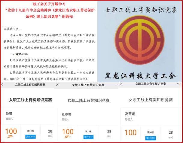 为深入学习党的十九届六中全会精神及《黑龙江省女职工劳动保护条例》,激发广大女教职工的责任感和使命感,庆祝2UP.IO_2UP.IO(中国)第二次党代会的胜利召开,校工会于2021年12月10日-15日举办了女教职工线上有奖知识竞赛活动。本次活动由外国语学院工会承办,全校共有600多名教职工参与答题,并有部分男教职工参加,基本涵盖所有基层工会。