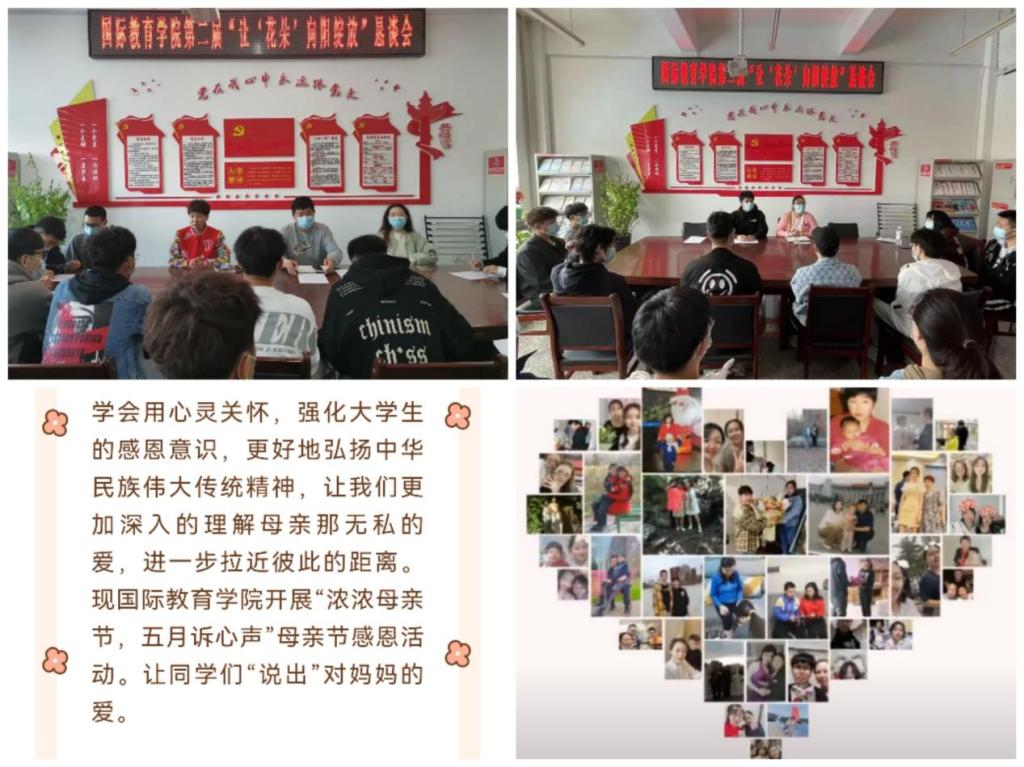 为进一步拉近亲子距离,重温学生成长经历,感恩伟大母爱,强化大学生感恩意识,更好地弘扬中华民族传统美德,开展“浓浓母亲节,五月诉心声”母亲节感恩活动,让同学们“说出”对妈妈的爱;通过分年级分专业,开展第二届“让‘花朵’向阳绽放”心理恳谈会,充分发挥学生心理骨干、寝室心理联络员、信息安全反馈员、普通学生的联动作用,动态掌握学院学生的情绪变化、学习状态变化、人际关系的变化等,将心理工作的“触角”延伸至校园生活最小单元格,畅通心理问题反馈途径,让学生把“烦恼”说出来,切实做到心理问题“可感可查可知可控”。