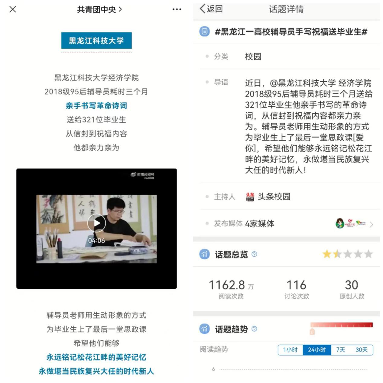加强理想信念教育,一份“礼物”暖学子。手写诗词,纸短情长,经济学院以毕业季为契机,将传统书法与毛泽东诗词相结合,让理想信念教育、爱国主义教育、党史学习教育更加生动鲜活。毕业年级辅导员老师从寒假开始精心准备,利用三个多月时间书写《长征》、《沁园春长沙》、《西江月井冈山》、《忆秦娥娄山关》等诗词,为学院2022届321名毕业生每人准备了一份难忘的毕业礼物,旨在引领学院青年学生领悟中国共产党人精神谱系的丰富内涵和时代意义,传承红色基因,赓续红色血脉。学院原创《纸短情长》主题视频播放次数达75.3万次,先后被共青团中央、学校共青团、中国教育报、教育部中国大学生在线、凤凰网教育、黑龙江共青团、中国青年网校园通讯社等官方媒体报道、评论。截至目前,微博话题阅读量达1162.8万次。