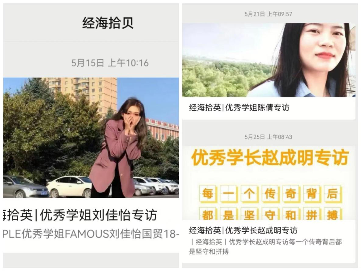 聚焦学风建设,一次分享树榜样。为宣传毕业生成长经历和经验做法,发挥榜样力量,激励低年级学生与先进并肩,用奋斗定义青春。5月15-25日,学院官方微信平台经海拾贝先后推出了刘佳怡、赵成明、刘欣、陈倩等4位优秀毕业生代表的成长经历,4位同学分别就求职就业经验、夯实专业理论基础,提高科研能力、在学生工作中提升自身综合素质、公务员考试备考经验等方面进行了分享,充分发挥了优秀毕业生的“传帮带”作用,也为低年级学生提供了宝贵经验和启示参考。