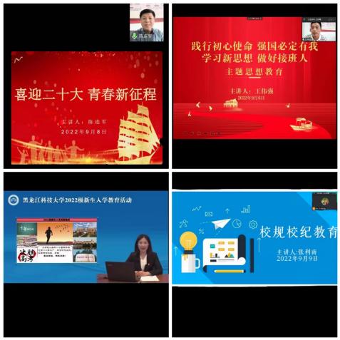 党委书记陈连军以“喜迎二十大,青春新征程”为题开展“开学第一课”,激发学生的责任感和使命感,使学生树立与时代主题同心同向的理想信念,以实际行动迎接党的二十大胜利召开;党委副书记王伟强以“践青春使命,强国必有我;学习新思想,做好接班人”为题进行了一场主题思想教育活动,号召同学们要自觉担当起时代使命,厚植理想信念之根,将“小梦想”与“强国梦”结合,不负韶华,不负时代;组织观看《入党启蒙教育》,帮助新生进一步了解党的基本知识,引导新生积极向党组织靠拢,做新时代新青年;四是学工办主任张利南对新生进行校规校纪教育,使新生自觉遵守校规校纪,提高文明自律意识,促进良好素养和文明习惯的养成。